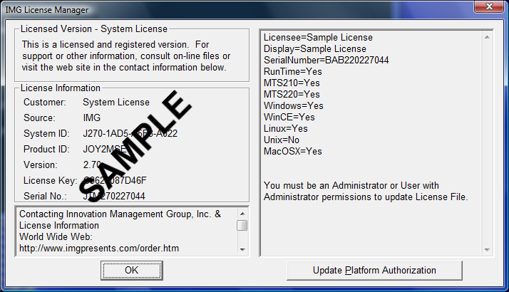 Note: To obtain additional platform licenses, please contact IMG Customer Service.