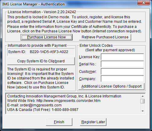 To quickly and easily license the software (on a system that has internet access), simply click on the "Purchase License Now" button. Once connected to IMG's website, you will be asked to enter billing information and payment information. Once paid, your order will be processed, and you will receive a confirmation e-mail and a separate e-mail with license information. Once the order is fully processed, you can then click the "Retrieve Purchased License" button to automatically license your system.