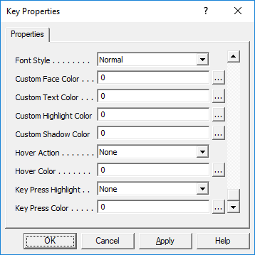 These are the font characteristics that define a Font per key - it is recommended you use the "..." button to use the Font dialog to easily select the font you wish, which will fill in these values - please be aware font support on the Run-Time target may be limited - see Fonts.