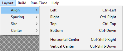 The Layout Menu has several sub-menus with options to align, space, size, and center selected keys.