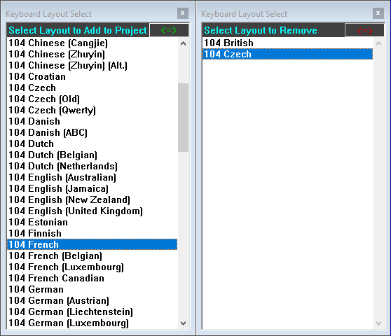 The Keyboard Layout Window shows Version 1.xx KMF layout files that contain different labels / actions from the older 1.xx software. The Keyboard Macro Files are essentially lookup tables that can be referenced when the correct reference option is put into the Key Label and Key Action key properties. As an example, look at the MTSBASIC layouts, e.g. MTSBASIC_0800_AO_BASE. If you look at the A key, you will see it shows the Key Label as {KMF:41}, the Shifted Key Label is {KMF:Shift-41}, and the Key Action is [KMF:41]. These overrides look at the current selected KMF to display the Key Labels, and perform the Key Action. The key Change Language uses the [CMD:NEXTKMF] to scroll through the available KMF files (as selected in the Keyboard Layout Window). To remove layouts, click on the <=> to toggle between available layouts and current layouts - select from available layouts to add, select from current layouts to remove. To see Key number reference for the KMF files, refer to the Build-A-Macro Notes in Advanced User Notes.