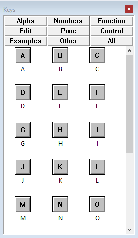 The Keys Window is a quick selection tool to drag and drop keys onto a board - there are various categories (Alpha, Numeric, Edit, All, etc.) You can toggle the view of the Keys window with the F8 key, the View menu | View Keys, or the Tool bar.
