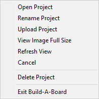 You can Open Project, View Image Full Size, Refresh View, Cancel, Delete Project, or Exit Build-A-Board.