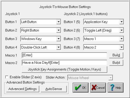 The default button press corresponds to Button 1 for Joystick 1. Refer to Joystick-To-Mouse Notes for information on how to change the default button, or review Advanced Settings).