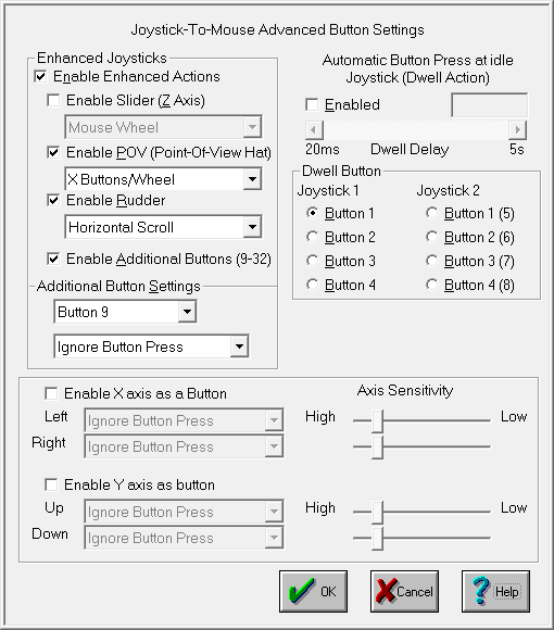This is the setting that controls the Joystick-To-Mouse monitoring of all of these enhanced actions. By default it is Enabled. You may clear the check box and Disable all monitoring of these controls. This setting must be On (Enabled) to monitor some or all of these controls. This setting MUST be On to work with Buttons 5-32, Z-Axis, the Rudder, POV, etc.