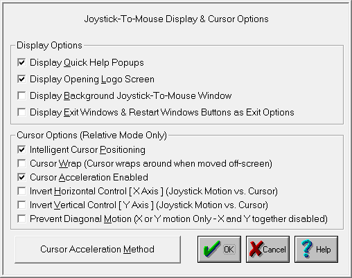 If this option is On, Joystick-To-Mouse will position the mouse cursor to the default button when Dialog Boxes are opened. You may find this speeds up your tasks if you always accept the default actions.