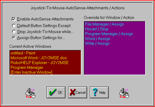 AutoSense Attachments allow you to assign a different set of Button Settings for each Application. This way, when the application becomes the Active Window, a different set of Button Settings ideally configured for the application will be in effect, improving your productivity. You may also assign the Stop action, which will disengage, or Stop Joystick-To-Mouse while the designated Window is the Active Window. This may be useful for games or other programs that utilize the Joystick within Windows.
