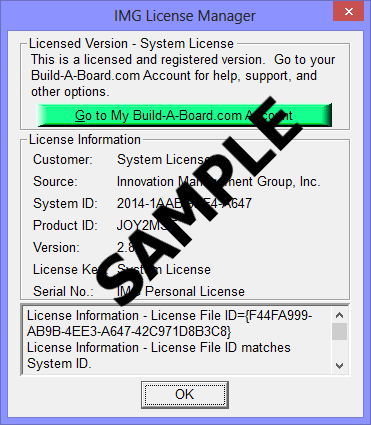 To quickly and easily license the software (on a system that has internet access), simply click on the "Retrieve System License" button. Once connected to IMG's website, you can use your existing Build-A-Board.com account, or you can select the type of License you wish to purchase. Once paid, your order will be processed, and you will receive a confirmation e-mail and a separate e-mail with license information. Once the order is fully processed, you can then click the "Retrieve System License" button to automatically license your system.
