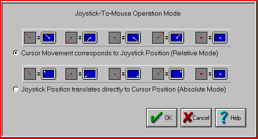 The Absolute Mode of operation ties the mouse cursor directly to the position of the joystick. When the joystick is in the center position, the mouse cursor is in the center of the screen. When the joystick is in the upper-left position, the mouse cursor will be in the upper-left area of the screen. When the joystick is in the lower-right position, the mouse cursor will be in the lower-right area of the screen. The joystick position corresponds exactly to the position of the mouse cursor on the screen.