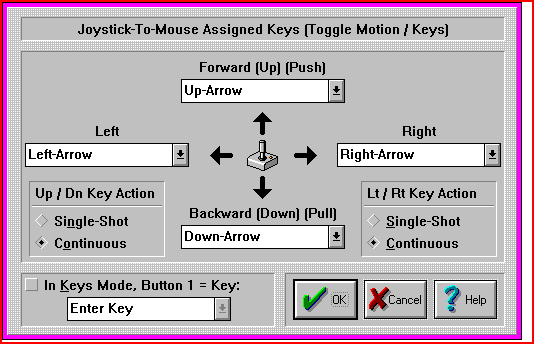When one of the Joystick Buttons is set to Toggle Motion / Keys, the Joystick can be toggled from a Pointing device (moving the Mouse Cursor), to a Keyboard device (the Joystick will be able to generate Keystrokes, or Keys Mode). The Keystrokes generated for the corresponding direction of the Joystick can be configured here, along with other options for this operating mode.