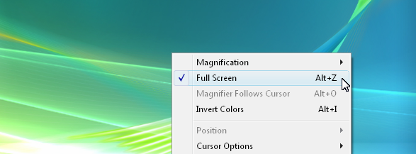 Full Screen When selected in the Full Screen mode of operation, this will clear this setting, and you will go to the Windowed mode of operation. Keyboard Shortcut: Alt-Z Refer to the previous chapter for details on running The Magnifier in the Windowed Mode of operation.