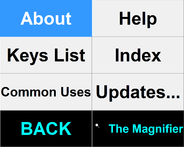 Help Menu The Help menu gives you access into this help document, shows information About this The Magnifier release, and allows you to check for updates. See Windowed Operation or Full Screen Operation.