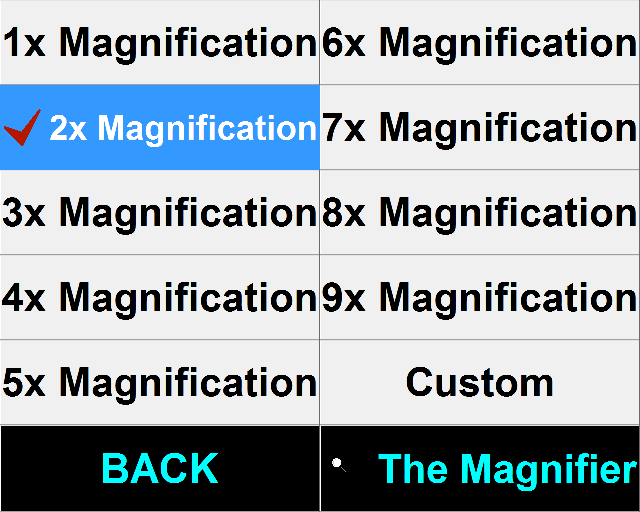 Magnification Menu The Magnification menu allows you to select various magnification factors, or open the Magnification dialog to customize the magnification level. See Windowed Operation or Full Screen Operation.