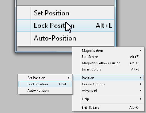 Lock Position This feature allows you to keep a specific spot on your computer's screen magnified in The Magnifier while you work. When you click on "Lock Position" a notification window will displayed indicating how to use the feature. You may move your mouse around to locate the exact magnification point. Once your mouse cursor is positioned at the desired location, click the with your left-mouse button. This will lock the area that is being magnified. To clear the lock, use Alt-L again, or clear the check mark in the Position menu.