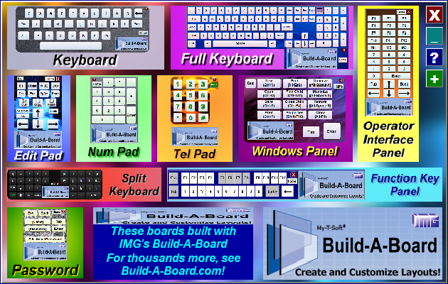 My-T-Soft Basic is the Windows run-time component of IMG's Build-A-Board, which allows custom on-screen keyboards, panels and boards. My-T-Soft Basic provides the program to display and operate these keyboards. When unlicensed, the Free Edition provides various useful keyboards, panels, and boards. When licensed, My-T-Soft Basic includes full keyboards in multiple languages and access to thousands of layouts from the Board database at Build-A-Board.com. My-T-Soft® is My Typing Software!