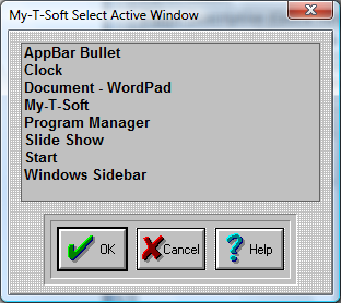 This list shows all of the current active windows running on your system. You may select the Window Name from the list. You may wish to modify the name to remove any open documents, or other information that may change. My-T-Soft TS must have an exact match to recognize the need to automatically open the Macro Panel.