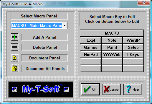 Advanced Notes: The panels included have been setup with various options to help illustrate the functions available. They may be changed or deleted as you desire. When running My-T-Soft TS, clicking the top panel of the Main Macro panel will open My-T-Soft TS Setup and go directly to Build-A-Macro. This is useful for fast macro panel / button changes. Macro Panels may be nested up to ten levels. Clicking on the top button of a nested panel will return to the previous panel, which is a shortcut for advanced users. In general, it is better to use a button to indicate the panel to open.