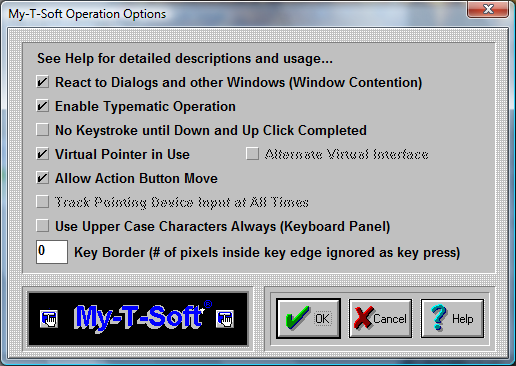 This setting should be set On if a the device used to move the mouse cursor (pointer) is not a standard mouse, or trackball. Any hardware device that interacts via a "device driver" with Windows should not be considered a Virtual Pointer (unless the implementation does not fully emulate a standard mouse [which is more common than otherwise]). Various Assistive Technology devices such as cameras or lasers that track the eye, other biometric sensors, or other software based translation interfaces (such as the MouseKeys in Microsoft's Accessibilities options) when used should have the Virtual Pointer setting On. This feature forces My-T-Soft TS to operate slightly differently for "Clicks" (button down, button up), and during moving the My-T-Soft TS window.