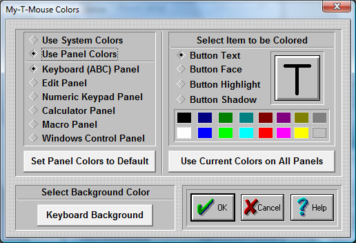 Select "Use Panel Colors" to use My-T-Mouse Colors. My-T-Mouse colors allows you to customize My-T-Mouse by coloring each panel's keys and buttons.