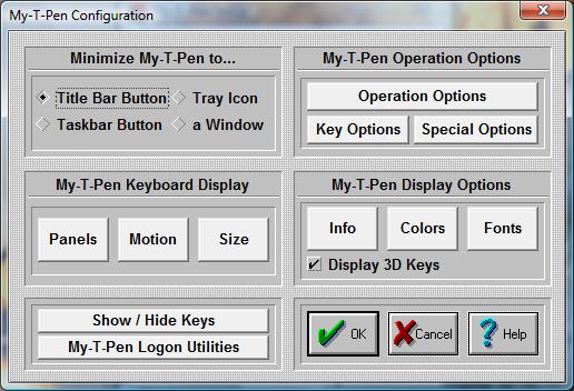 The six buttons in the middle of the dialog box offer additional configuration options for My-T-Pen.