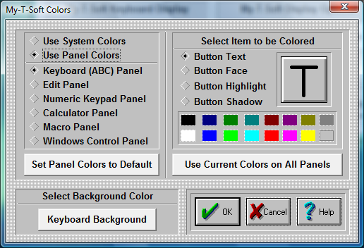 Select "Use Panel Colors" to use My-T-Soft Colors. My-T-Soft colors allows you to customize My-T-Soft by coloring each panel's keys and buttons.