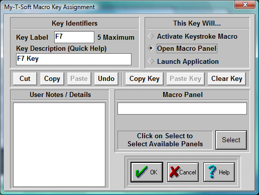 Enter a key label. This label will appear on the key in the Macro Panel. Enter a key description. The key description will appear in the Quick Help bar.