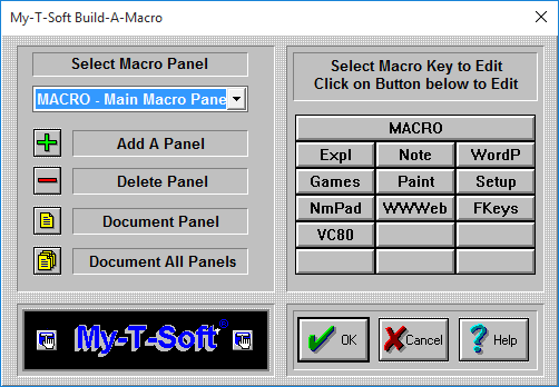 Advanced Notes: The panels included have been setup with various options to help illustrate the functions available. They may be changed or deleted as you desire. When running My-T-Soft, clicking the top panel of the Main Macro panel will open My-T-Soft Setup and go directly to Build-A-Macro. This is useful for fast macro panel / button changes. Macro Panels may be nested up to ten levels. Clicking on the top button of a nested panel will return to the previous panel, which is a shortcut for advanced users. In general, it is better to use a button to indicate the panel to open.
