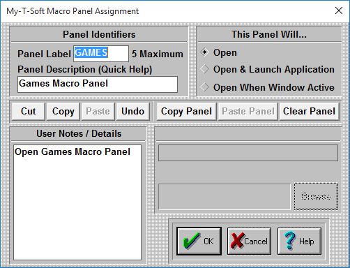 Click on this Radio-Button if you want to assign an application to this Macro Panel. Enter the application name and path in the edit box below (Application), or press Browse to select an application. You may also enter a Working Directory that will become the current directory when the Application is launched. When accessed, the panel will open & then automatically launch the application.