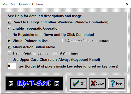 This setting should be set On if a the device used to move the mouse cursor (pointer) is not a standard mouse, or trackball. Any hardware device that interacts via a "device driver" with Windows should not be considered a Virtual Pointer (unless the implementation does not fully emulate a standard mouse [which is more common than otherwise]). Various Assistive Technology devices such as cameras or lasers that track the eye, other biometric sensors, or other software based translation interfaces (such as the MouseKeys in Microsoft's Accessibilities options) when used should have the Virtual Pointer setting On. This feature forces My-T-Soft to operate slightly differently for "Clicks" (button down, button up), and during moving the My-T-Soft window.