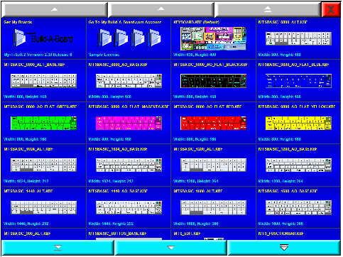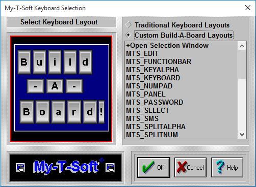 There are various sample, custom Build-A-Board Layouts available. Additional Build-A-Board layouts can be created, and when placed in the Public Documents Build-A-Board BOARDS folder, will be added to this list. When selected, the KEYBOARD.KBF in the users configuration folder is replaced with the selected layout. When My-T-Soft is run, the layout is recognized, and the Build-A-Board compatible run-time (MYTSOFT2.EXE) is used to operate with the version 2.x keyboard layouts.