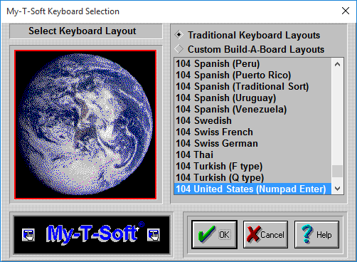 My-T-Soft can operate with many different keyboard layouts. By selecting the same keyboard layout that Windows uses, you can synchronize the display on My-T-Soft with the characters generated in your application.