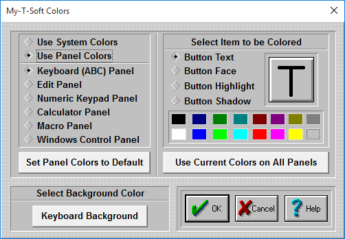 Select "Use Panel Colors" to use My-T-Soft Colors. My-T-Soft colors allows you to customize My-T-Soft by coloring each panel's keys and buttons.