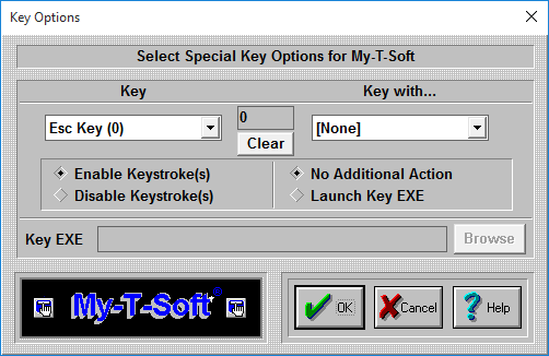This defines the state of the particular key and its current modifier (Ctrl, Shift, Alt). If Enabled, then My-T-Soft will generate & send the keystroke. If Disabled, then the keystroke(s) will be removed and no action by My-T-Soft will occur when the particular keystroke(s) is/are initiated by the user. Note that this action is independent of the Launch Key EXE capability.