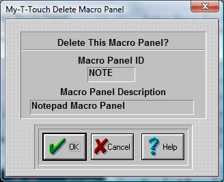 Use with extreme caution. Once the panel is deleted, it cannot be recovered! Press the OK Button to Delete the Selected Macro Panel. If you do not want to delete your panel, press the CANCEL button. |