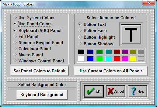 Select "Use Panel Colors" to use My-T-Touch Colors. My-T-Touch colors allows you to customize My-T-Touch by coloring each panel's keys and buttons.