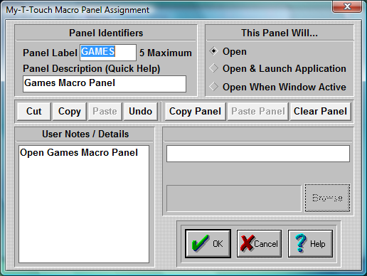 Click on this Radio-Button if you want to assign an application to this Macro Panel. Enter the application name and path in the edit box below (Application), or press Browse to select an application. You may also enter a Working Directory that will become the current directory when the Application is launched. When accessed, the panel will open & then automatically launch the application.