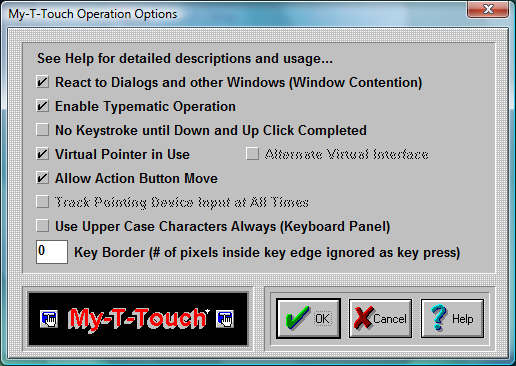 This setting should be set On if a the device used to move the mouse cursor (pointer) is not a standard mouse, or trackball. Any hardware device that interacts via a "device driver" with Windows should not be considered a Virtual Pointer (unless the implementation does not fully emulate a standard mouse [which is more common than otherwise]). Various Assistive Technology devices such as cameras or lasers that track the eye, other biometric sensors, or other software based translation interfaces (such as the MouseKeys in Microsoft's Accessibilities options) when used should have the Virtual Pointer setting On. This feature forces My-T-Touch to operate slightly differently for "Clicks" (button down, button up), and during moving the My-T-Touch window.