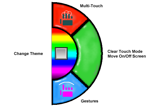 The large Green touch area will clear (turn off) the current touch mode (Multi-Touch or Gestures) and operate in the normal mode (Note: Flicks are supported in normal mode). If the current mode is currently "normal" (no Multi-Touch or Gestures), then a touch will move My-T-Touch off-screen. When off-screen, a touch will bring My-T-Touch back onscreen.