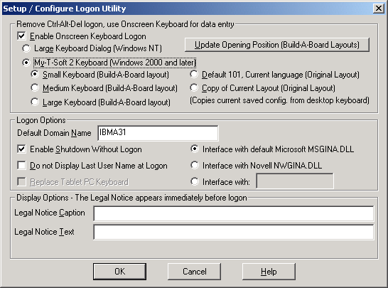 The My-T-Soft 2 option for the Logon portion of Windows 2000 / XP uses MTS2.EXE, a special build of My-T-Soft 2 for this usage. The layout displayed by My-T-Soft 2 is the KEYBOARD.KBF file in the LOGON folder under the installation directory. The above options in the Logon Utilities handle this manipulation for you. If you use Build-A-Board to create your own layout, you will want to copy your "built" layout into the LOGON folder, AFTER selecting the My-T-Soft 2 option in the Logon Utilities. Note that if you re-run the Logon Utilities, and click OK on the Setup/Configuration screen, your "built" layout will be copied over! For reference, or if you want to take over the pre-built layouts, this lists the file names and their associated selection in the Logon Utilities: