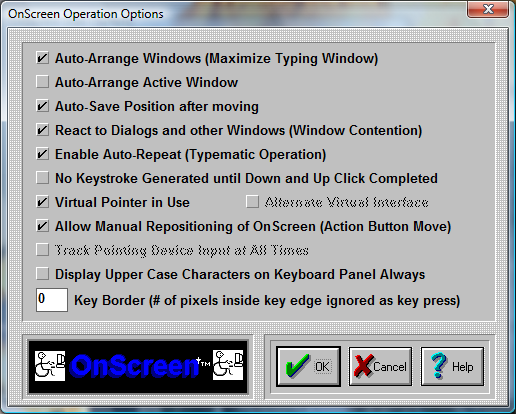 IMPORTANT NOTE: There are various settings here to change how OnScreen operates. If you are having problems typing, see Interface Settings.