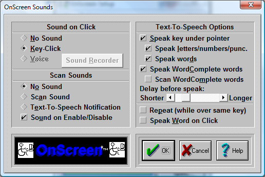 There are 2 main areas of sound feedback available in OnScreen - Key Press Acknowledgement (feedback), and Text-To-Speech
