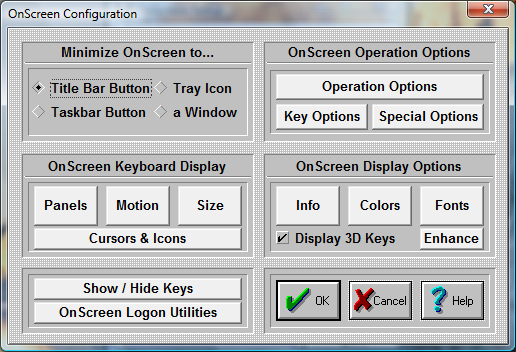 The six buttons in the middle of the dialog box offer additional configuration options for OnScreen.
