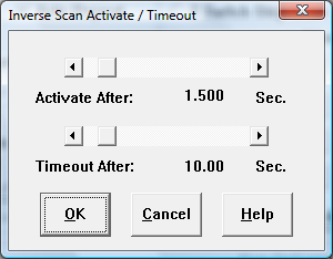 The Inverse Scan uses the Mouse or Joystick button as a stop/go control. When the selected device button is down, scanning will continue, and when up, scanning will stop. The click is automatic based on settings in the Inverse Scan Activate / Timeout dialog. After a stop for the activation time, the next step in the CrossScanning process will occur (see Auto Scan). If there is no go signal (button down) during the Timeout time, the scan will be stopped.
