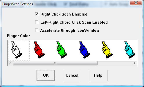Enabling Right Click Scan Enabled allows FingerScan to 'bounce' off of the right edge of the CrossScanning area and 'become' a right click. This feature is enabled by default. The Left-Right Chord Click Enabled allows a third scan of the screen (After the right-to-left Right Click Scan). This allows the action of simultaneous Left & Right button clicks together (so named from the musical analogy of a Chord). Certain applications use this, and it has been included for completeness.
