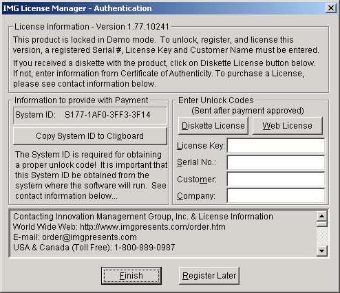 To quickly and easily license the software (on a system that has internet access), simply click on the "Purchase License Now" button. Once connected to IMG's website, you will be asked to enter billing information and payment information. Once paid, your order will be processed, and you will receive a confirmation e-mail and a separate e-mail with license information. Once the order is fully processed, you can then click the "Retrieve Purchased License" button to automatically license your system.
