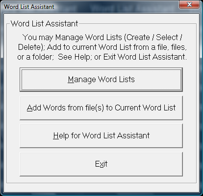 Advanced Notes: The 2 folders that Word List Assistant works with are the configuration files folder (where the current Word List files are located), and the WordLists sub-folder (where compressed Word Lists are stored, and where temporary Word List files are created (e.g. A.TXT, B.TXT, etc.)). When Managing Word Lists within the Word List Assistant, it is important to realize the "Current" word list is never touched or modified, unless one of the options to modify it is selected (Add Words from Files to Current Word List, Manage Word Lists | Merge Word List with Current, and Manage Word Lists | Make Selected Word List Current).