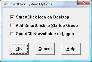 There are 3 options available: SmartClick Icon on Desktop, Add SmartClick to Startup Group, and SmartClick Available at Logon (Vista only)