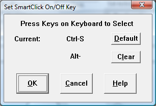 The SmartClick On/Off key is used to toggle the SmartClick Palette from a visible mode, to a hidden mode while SmartClick is running within Windows. Within Setup, you may select the On/Off Key (or combination of keys) used to Show/Hide SmartClick. You may use keys F1 through F12, 0 through 9, and A through Z, by themselves, or in any combination with Ctrl, Shift, and/or Alt. Make sure SmartClick is not running when you select the On/Off Key.