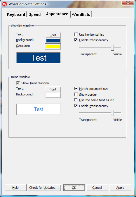 Enable transparency - Makes the Word List candidate window transparent. Use the slider to adjust the level of transparency.